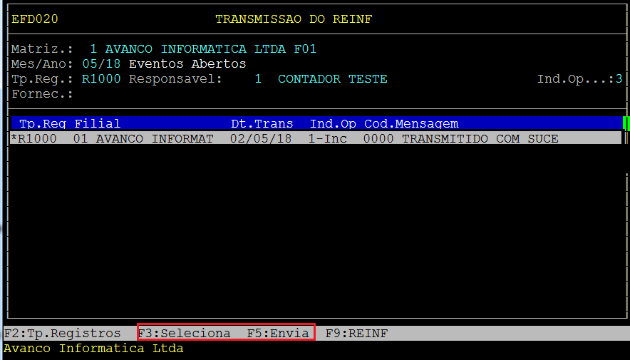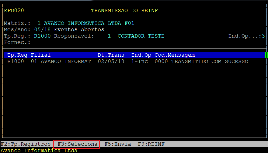 Em seguida digite a função "F3: Seleciona" para selecionar o Evento a ser enviado, o mesmo será marcado com (*) e "F5 : Envia".