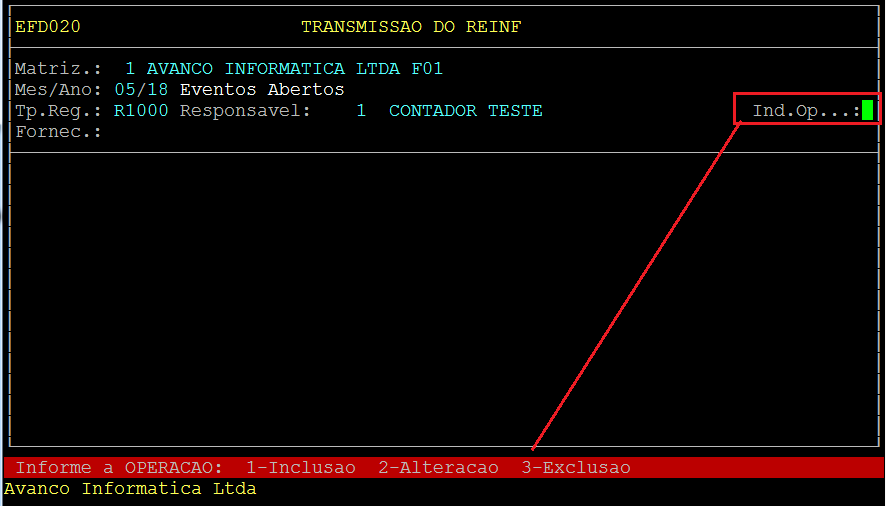No campo "Ind.Op" digite a informação 3 - Exclusão.