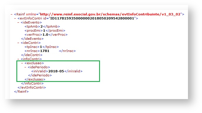 No Arquivo XML serão gravadas as informações na "Tag" de "Exclusão".