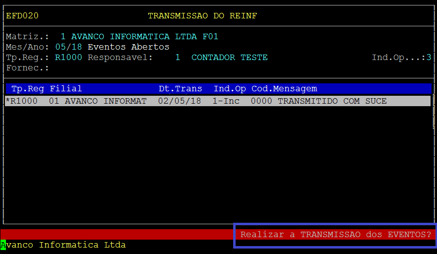 Após digitar a função "F5 : Envia" será exibido a pergunta "Realizar a Transmissão dos Eventos?".
