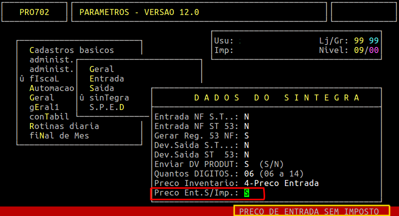 Em seguida, no campo Preco Ent.S/Imp, informe a letra S, para definir que o Preço do Inventário será enviado para o Sped Fiscal sem impostos.