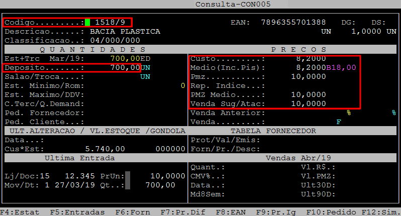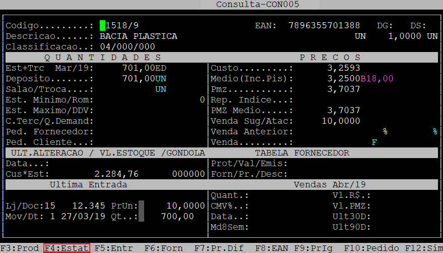 Ao acessar a tela da Ficha Financeira do Produto, pressione a tecla F4, para acessar a tela da Ficha Estatística.