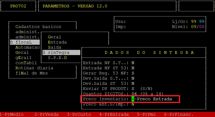 Ao acessar a rotina, pressione a tecla Enter para percorrer os campos até alcançar o campo Preco Inventario, no qual deverá informar o número 4, referente ao preço de entrada.