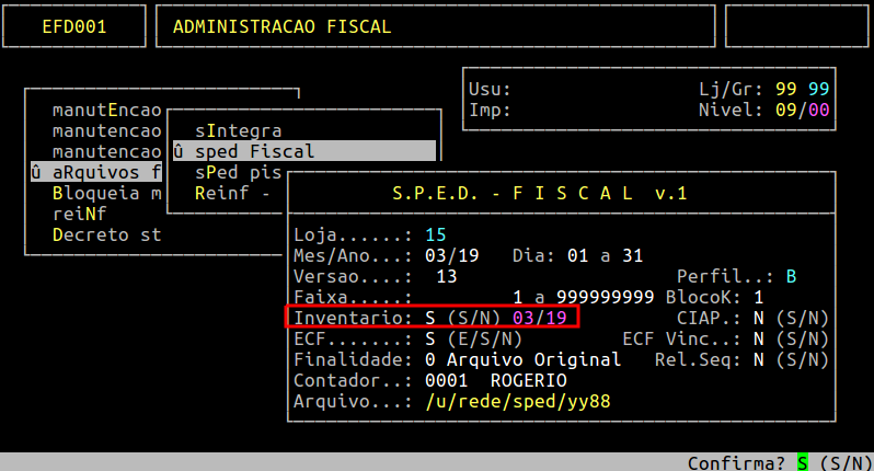 Informe os dados para a geração do Sped, sendo que no campo Inventario deverá ser preenchido com a letra S e no campo à frente com o mês e o ano referente a geração do Inventário.
