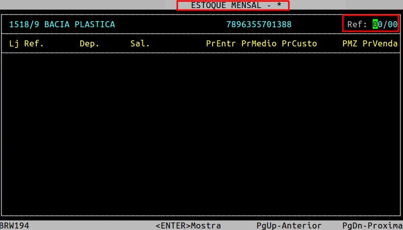 Ao acessar a tela Estoque Mensal, pressione a tecla F5 para consultar o estoque fiscal, e na sequência, no campo Ref, informe o mês e o ano desejados.