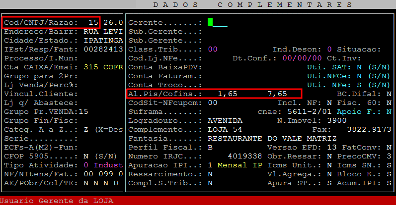 Ao acessar a rotina, informe o número da loja desejada, pressione a tecla A para alterar, e pressione a tecla Enter para percorrer pelos campos até acessar a tela Dados Complementares.