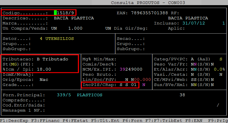 No exemplo abaixo, o cadastro do Produto se encontra com Tributação ICMS 18%, com incidência de Pis e Cofins.