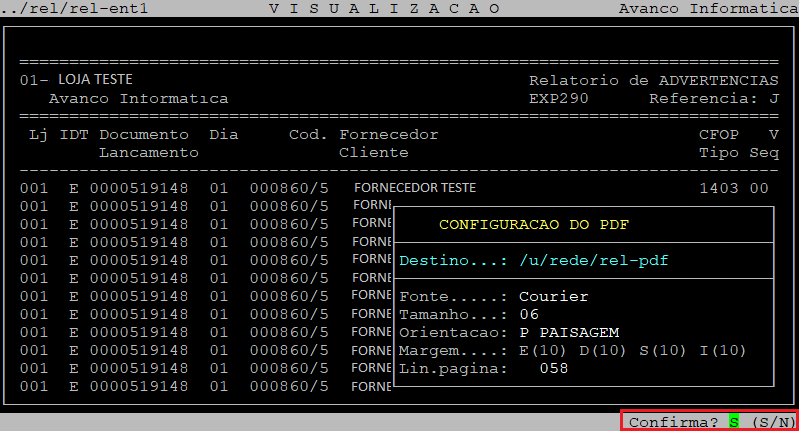 Se desejar visualizar em pdf deverá apertar a tecla P e depois a tecla S até confirmar para gerar o relatório na pasta /u/rede/rel-pdf, do servidor Avanço, conforme o exemplo abaixo.