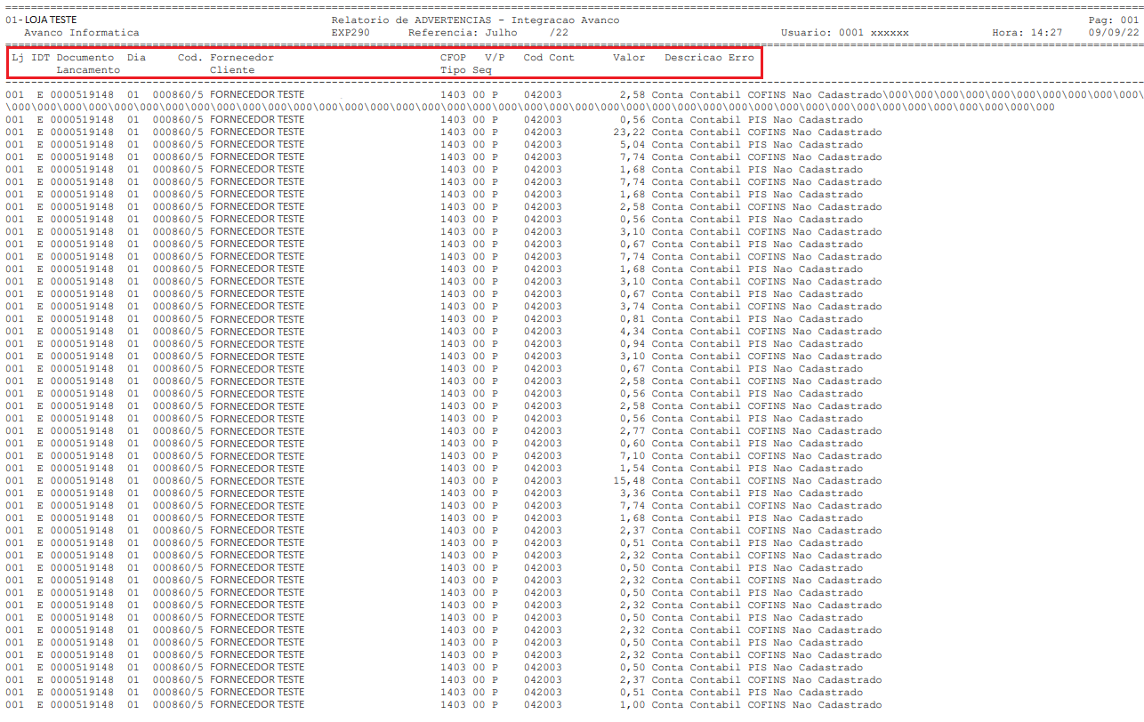 No exemplo abaixo o relatório será emitido com as advertências referentes as contas contábeis de Pis/Cofins.