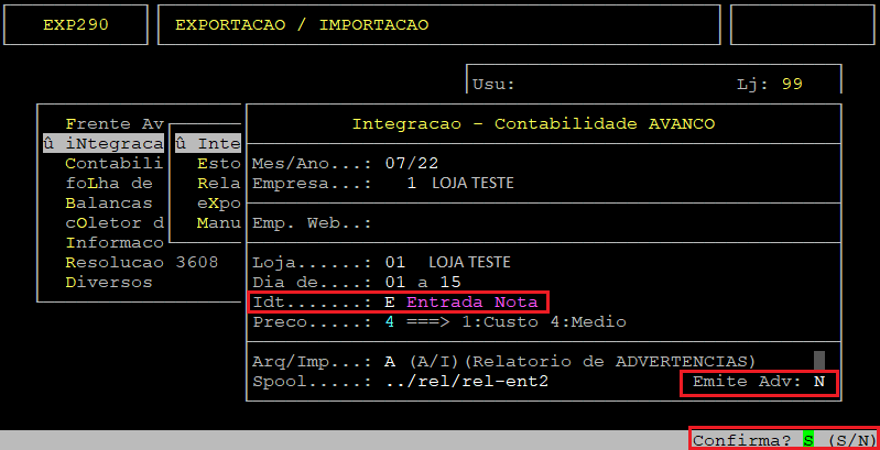 | Emite Adv: | Informe a letra S se desejar emitir as advertências referentes as contas contábeis de Pis/Cofins, ou N para não emitir. |