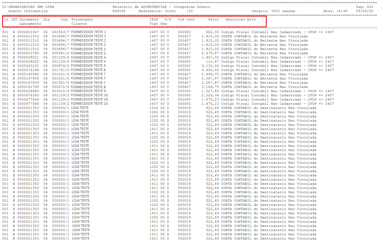 | Descrição Erro: | Refere-se ao erro do documento/lançamento. Será ou não exibido os erros PIS/COFINS de acordo com a configuração do campo Emite Adv. |