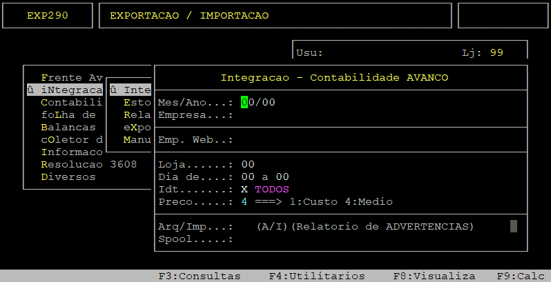 Ao acessar a rotina Integração - Contabilidade AVANCO preencha os campos conforme desejado.