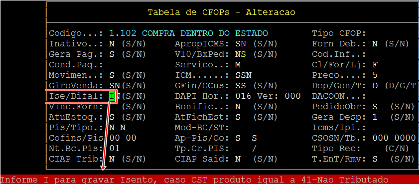 Deve-se acessar a rotina de alteração da tabela de CFOP, escolher o(s) código(s) que deseja e marcar com a letra " I " no campo Ise para gravar na coluna Isentas do Livro de Apuração do ICMS as movimentações que contém produtos com o CST 041 (Não Tributado).