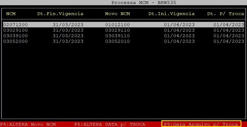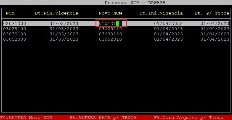 Quando o cursor sair da coluna Novo NCM aperte a tecla F9 para gerar novo arquivo para troca.