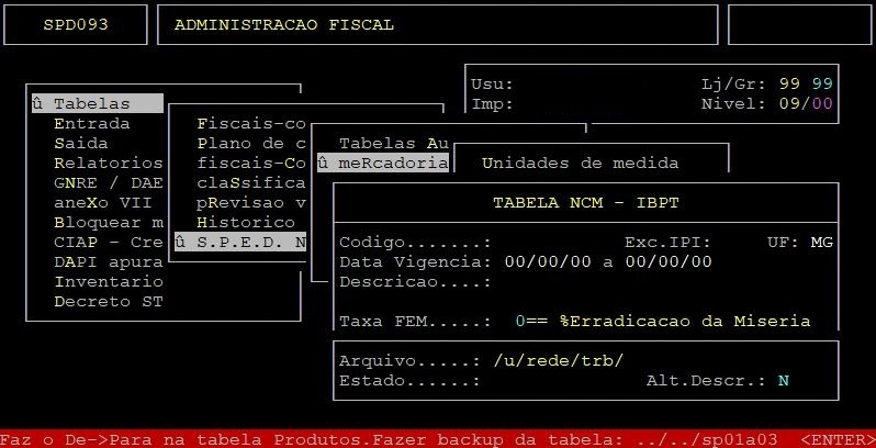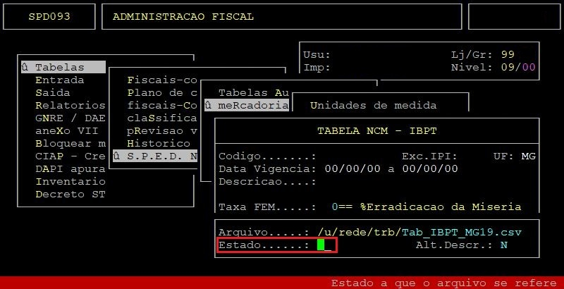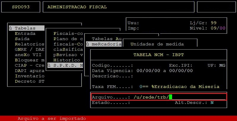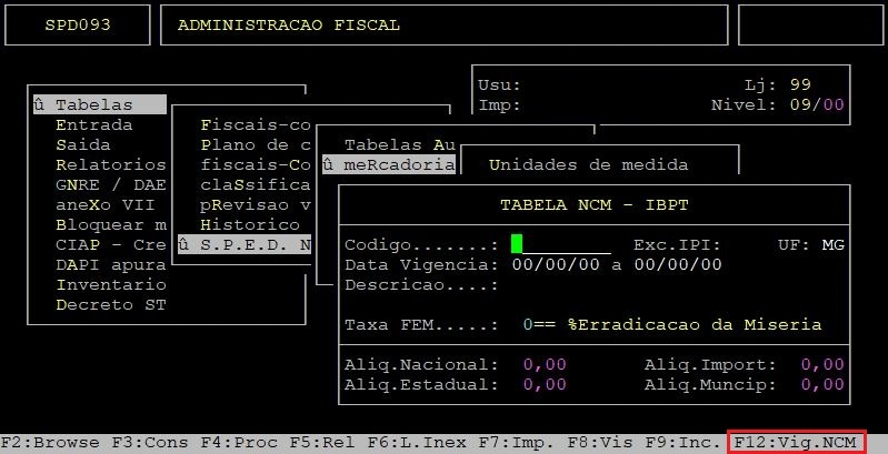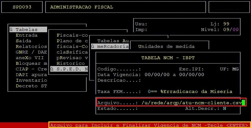 OBSERVAÇÕES: A função F7 é para atualizar os impostos dos NCMs já existentes no cadastro. A função F9 é para incluir novos NCMs e alterar a vigência final dos que deixarão de ser válidos, utilizando o arquivo atu-ncm.csv situado no diretório /u/rede/arqp. |