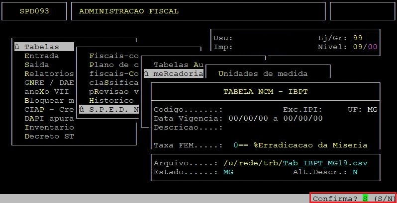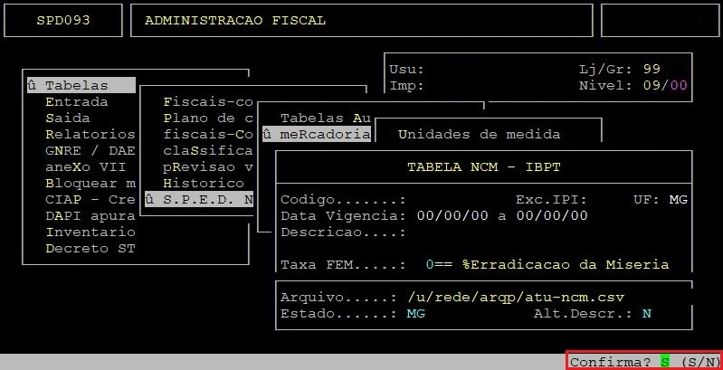 Em seguida, será exibida a pergunta "Confirma?", no qual deverá apertar a tecla Enter ou S para confirmar e importar a tabela NCM.
