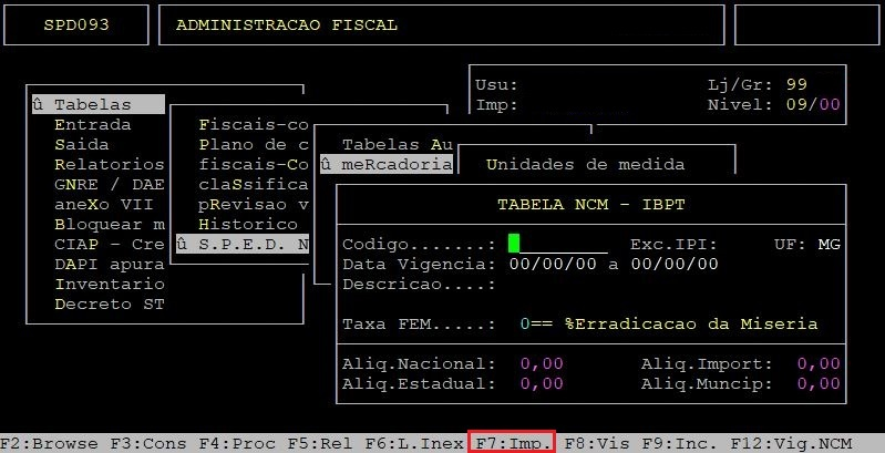 Para atualizar a tabela NCM, através da importação do arquivo, aperte a tecla F7.
