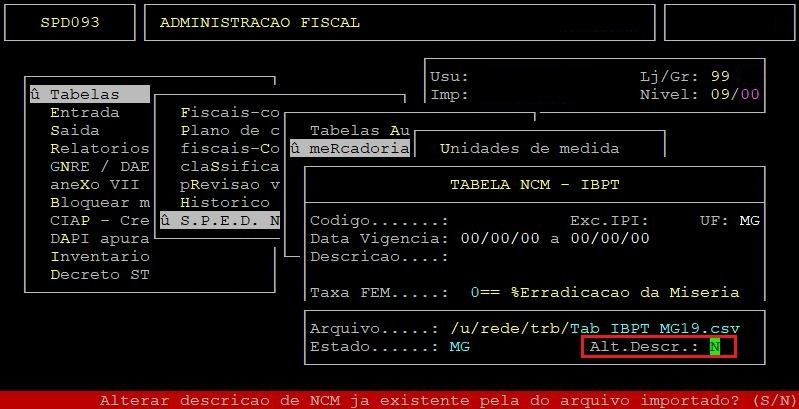No campo Alt.Descr informe a letra S se desejar alterar a descrição de NCM já existente no sistema pela do arquivo a ser importado, ou N para manter a descrição.