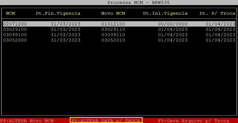 Se desejar alterar a data para troca dos NCMs atualizados, na tela Processa NCM aperte a tecla F6 do teclado.