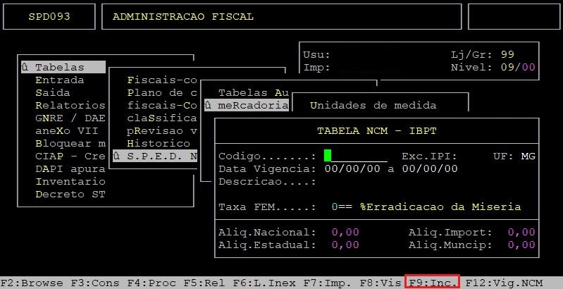 Para atualizar a tabela NCM, através da inclusão, aperte a tecla F9 do teclado.
