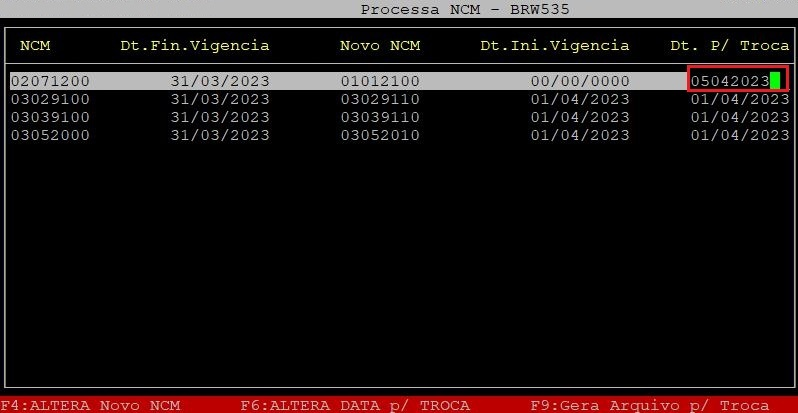| Dt. P/ Troca: | Data do arquivo em que será realizado a alteração dos NCMs novos no sistema. |