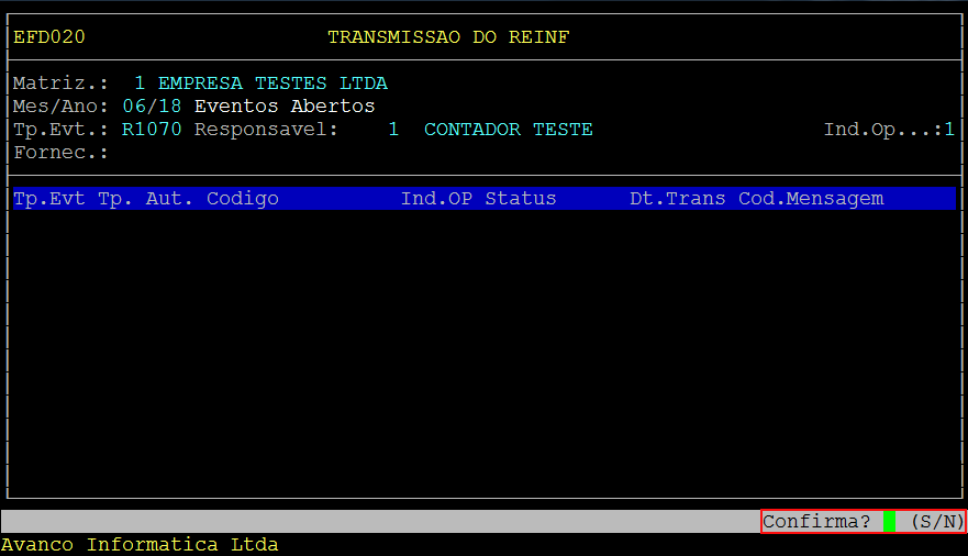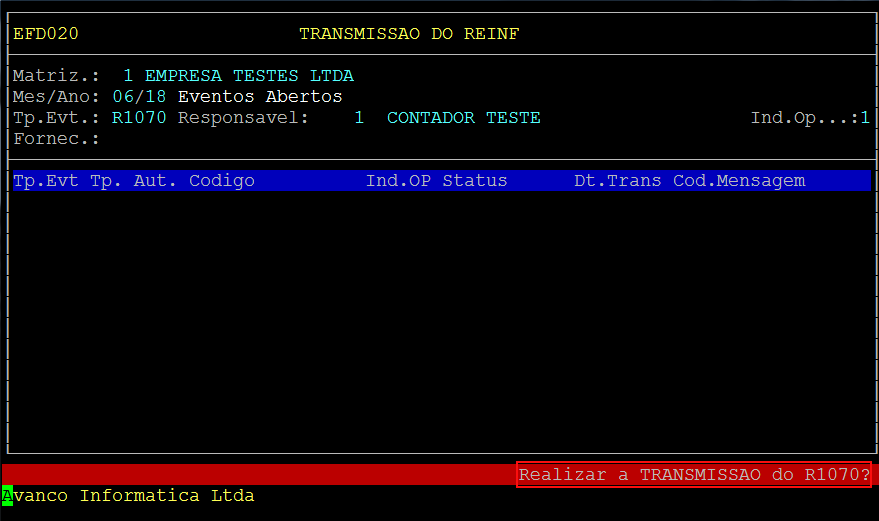 Após, será exibida a pergunta: Realizar a Transmissão do R1070?. Para realizar a transmissão, confirme pressionando a tecla S (Sim).