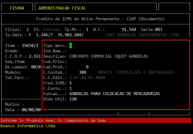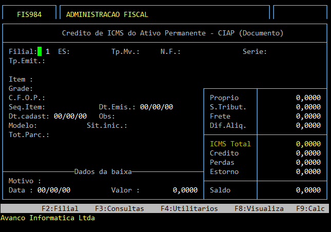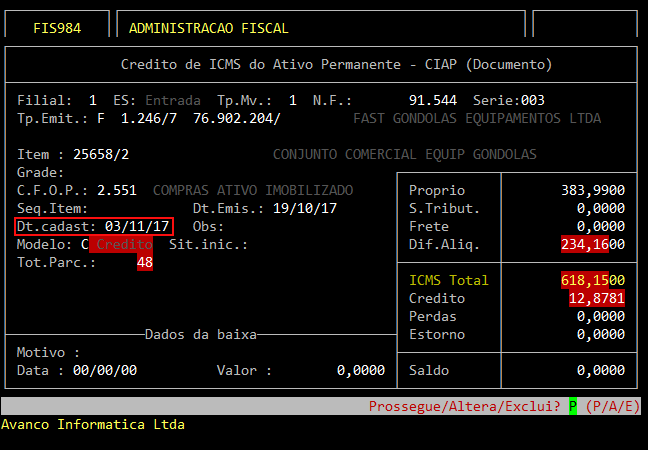 | Rotina: | Crédito de ICMS do Ativo Permanente - CIAP (Documento) |