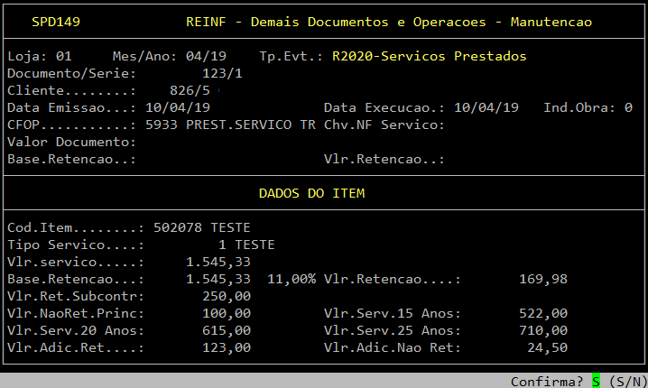 Assim que preencher os campos acima, pressione a tecla Enter até confirmar e gravar a inclusão da nota fiscal no Evento R2020.