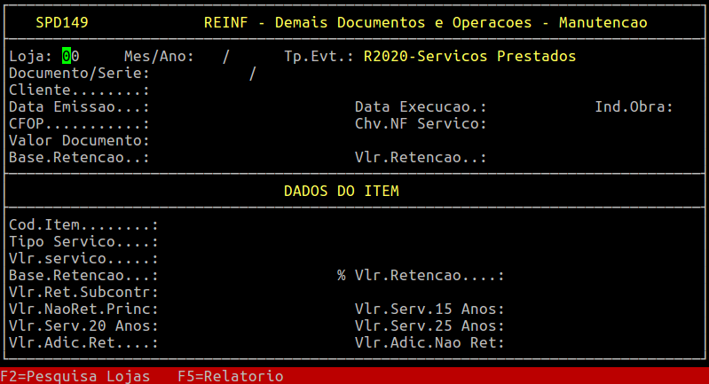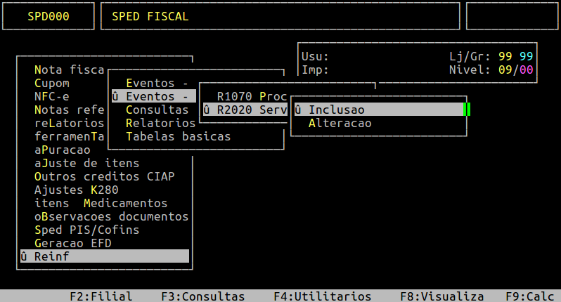 | Localização: | Sped - Efd / Reinf / Eventos - Inclusao / R2020 Serv. Prestados / Inclusao |