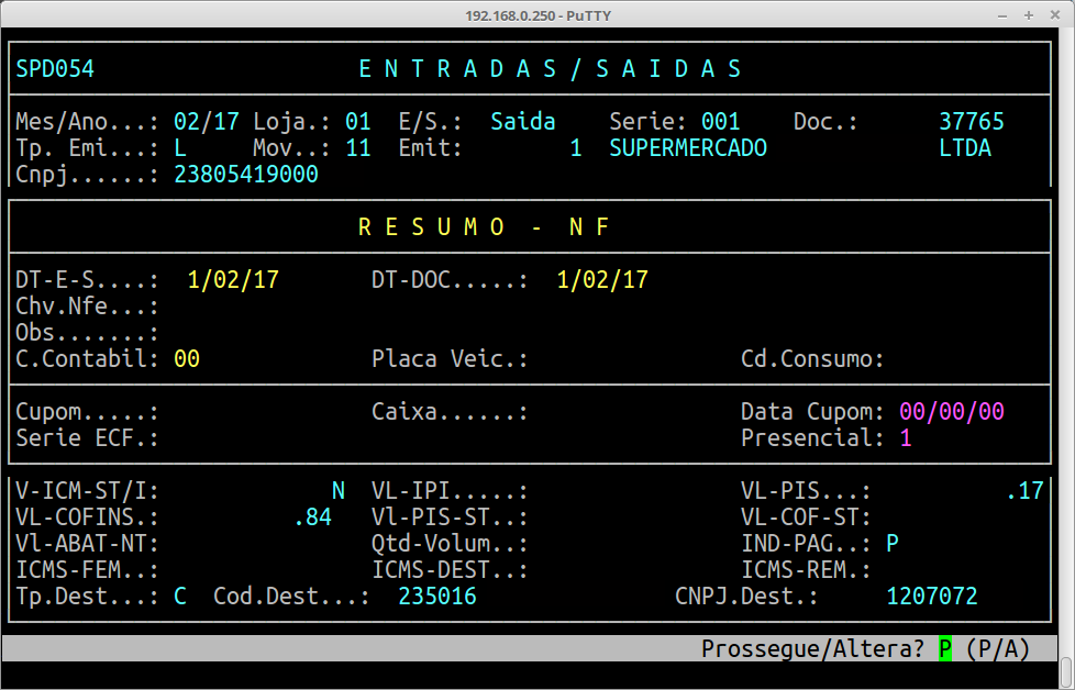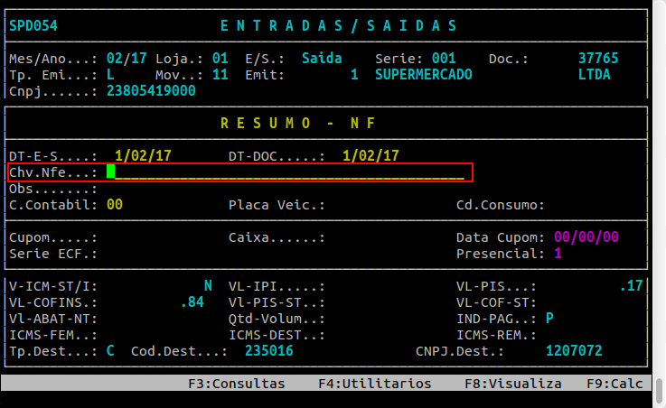 O sistema irá exibir a mensagem: "Prossegue/Altera", pressione a tecla A para alterar e pressione a tecla ENTER duas vezes até chegar ao campo Chv.Nfe.