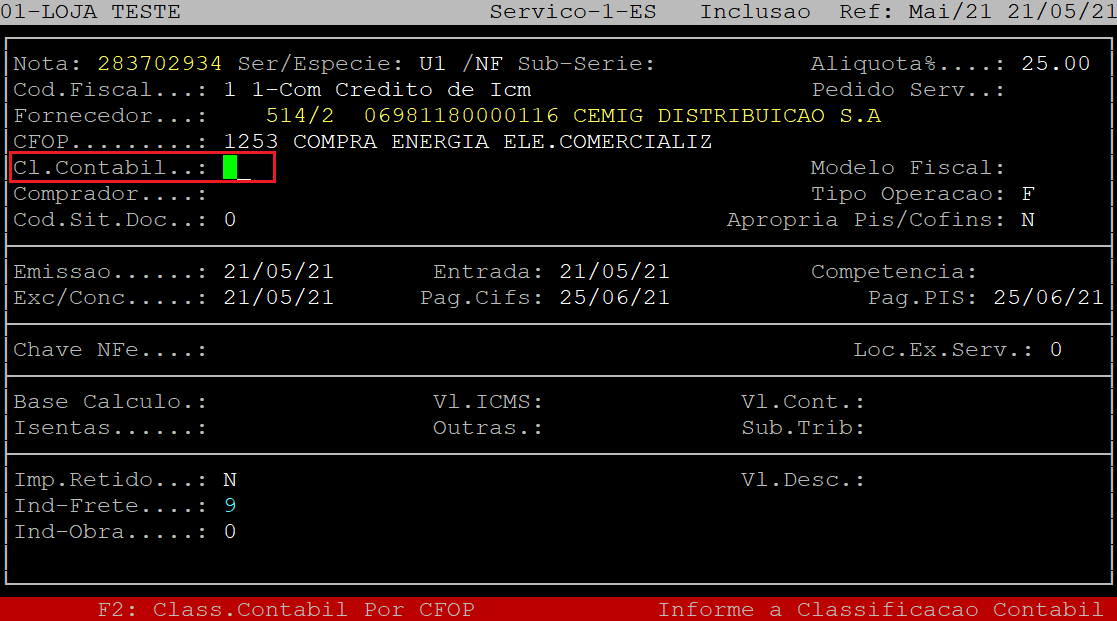 No campo Cl.Contabil, informe o Código Contábil para o lançamento. Se não existir, apenas aperte a tecla Enter para prosseguir para o próximo campo.