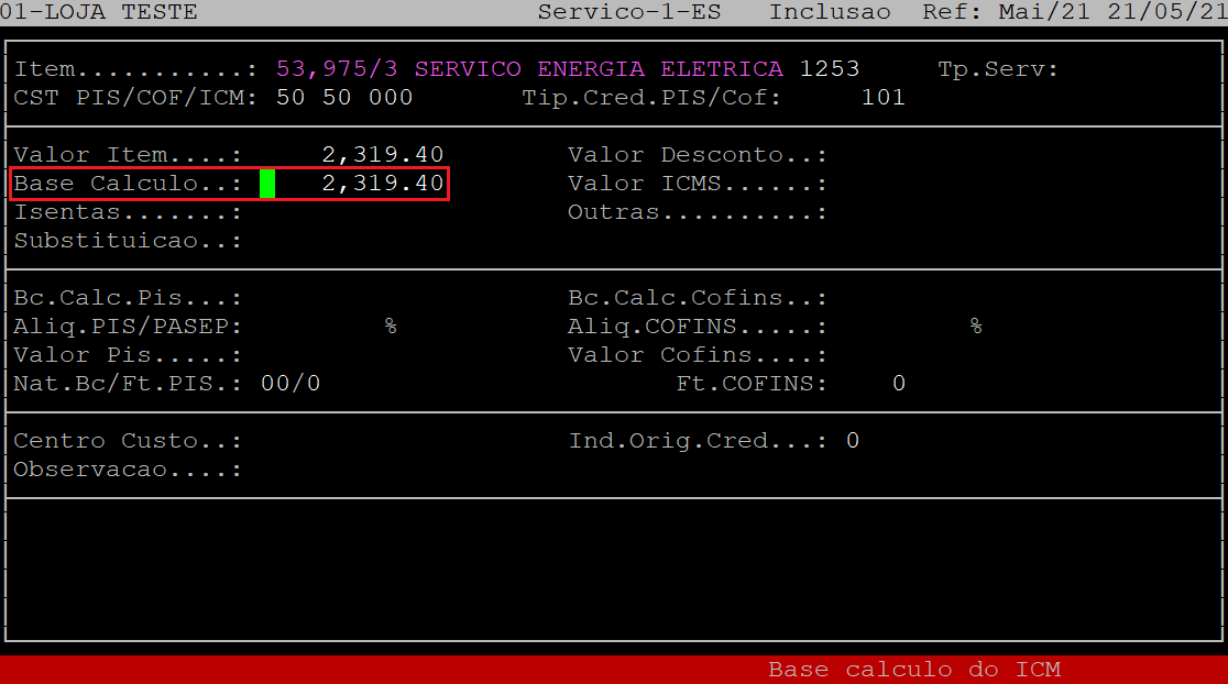 No campo Base Calculo, informe a base de Cálculo do ICMS e, aperte a tecla Enter. Porém, se o campo Aliquota% não for informado, apenas aperte a tecla Enter para prosseguir.
