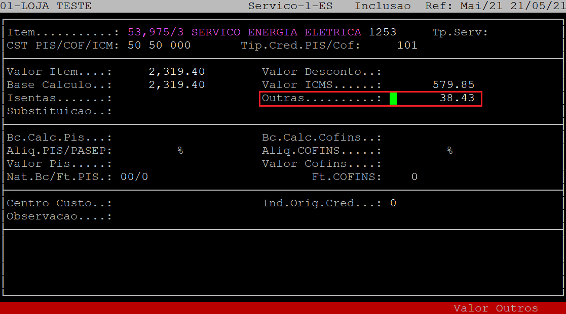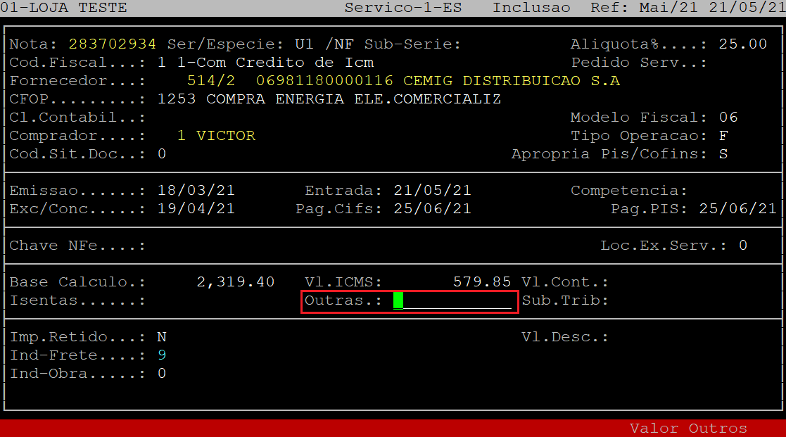 No campo Outras, informe o valor de outras da nota fiscal (valor não tributado) e, aperte a tecla Enter. Se não existir esse valor, apenas aperte a tecla Enter para prosseguir para o próximo campo.