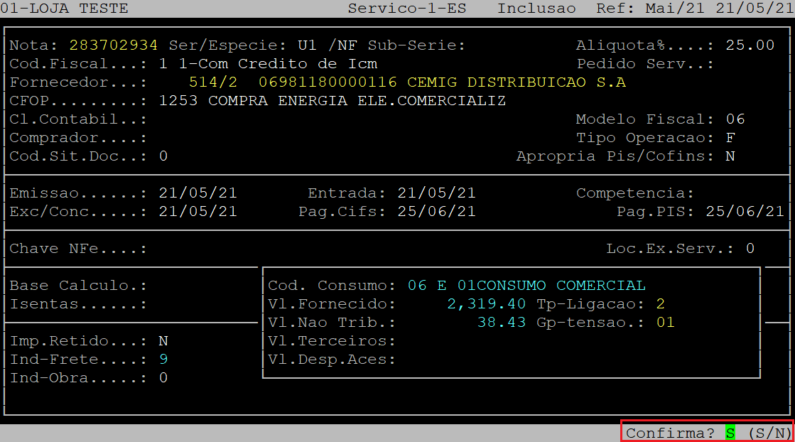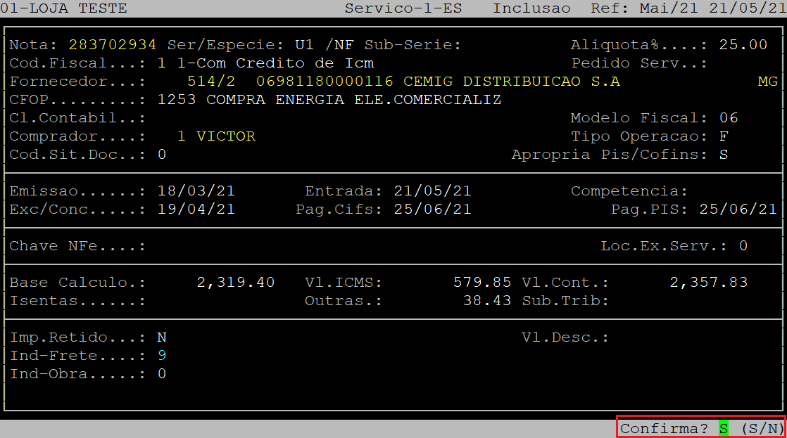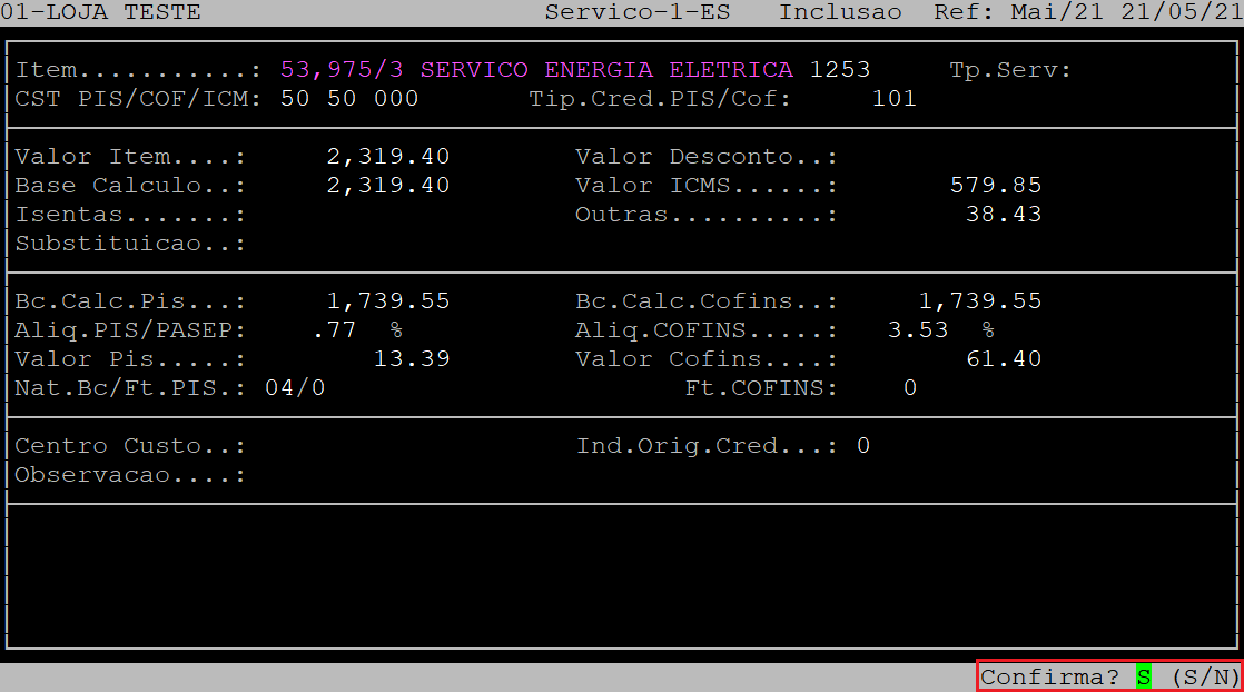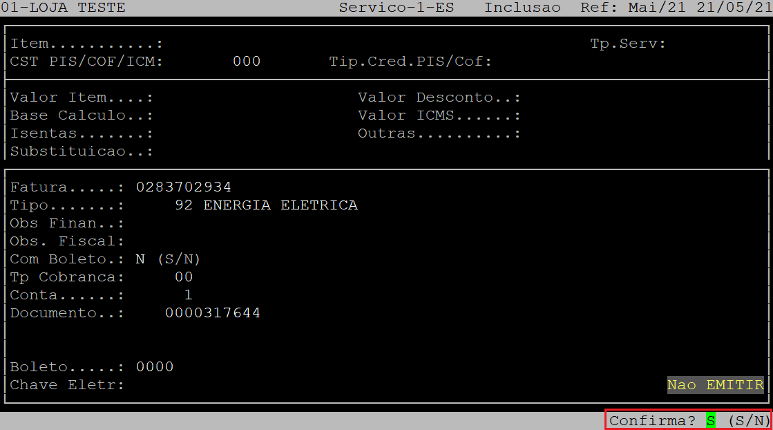 Ao ser exibida a pergunta " Confirma? ", aperte a tecla Enter ou a letra S para confirmar os dados financeiros.