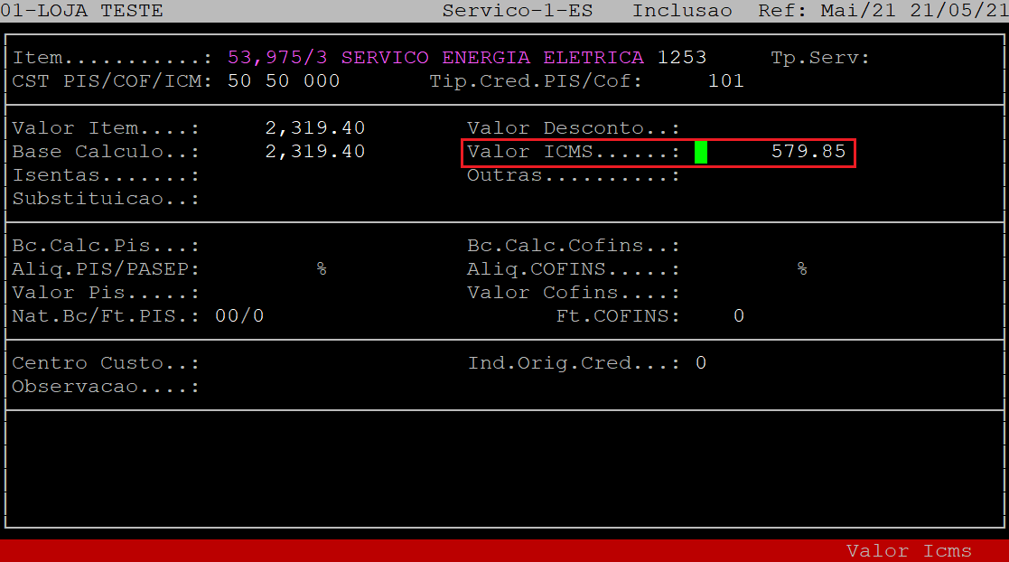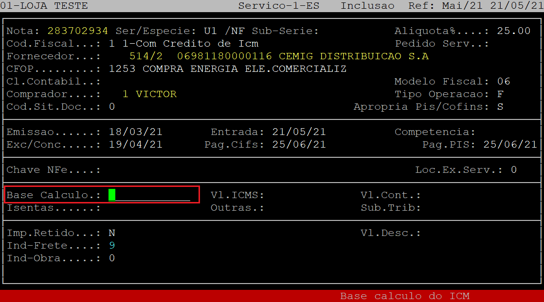 No campo Vl.ICMS, o sistema preencherá automaticamente o valor do ICMS de acordo com a base e alíquota informada. Aperte a tecla Enter para prosseguir. Se não existir esse valor, apenas aperte a tecla Enter para prosseguir para o próximo campo.