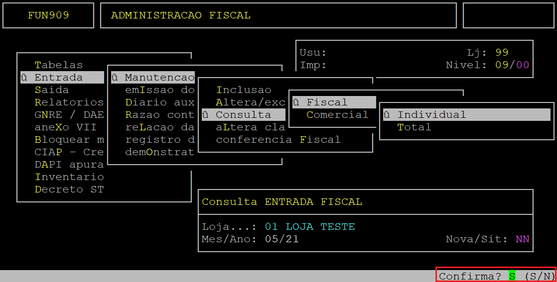 Assim que preencher as informações acima, o sistema exibirá a pergunta " Confirma? ", no qual deverá apertar a tecla Enter ou S para confirmar e acessar a rotina.