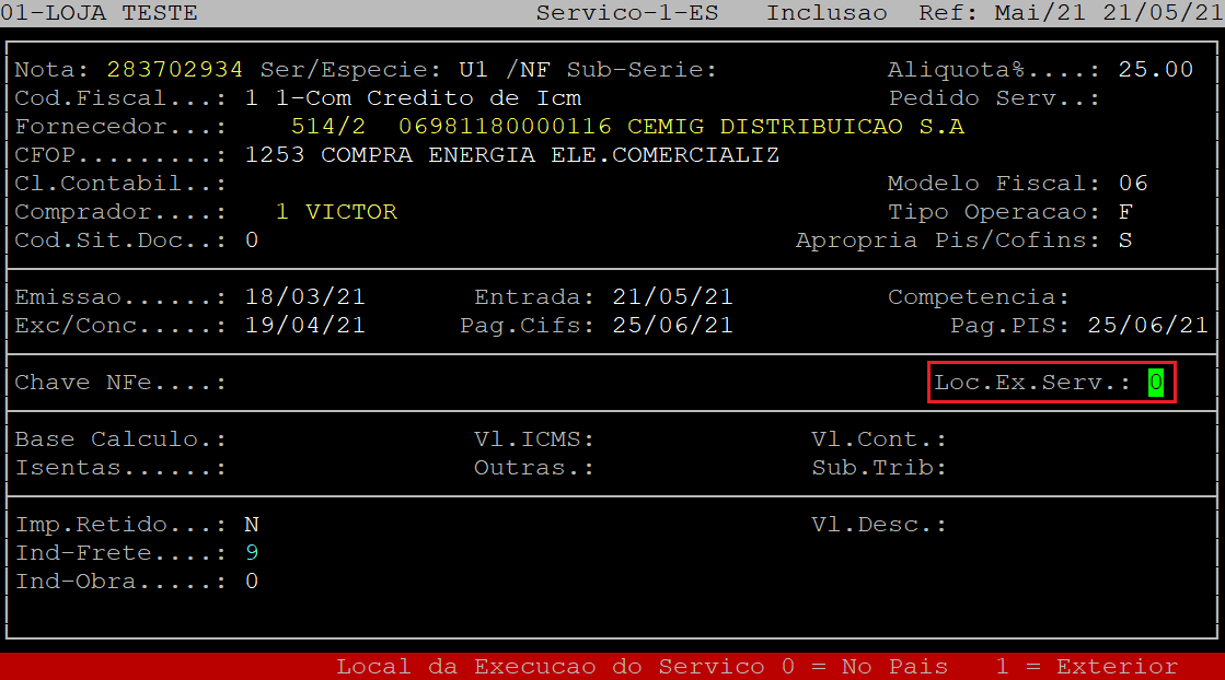 No campo Loc.Ex.Serv, informe o código correspondente ao local de execução do serviço, sendo: 0 - no país, ou 1 - no exterior.