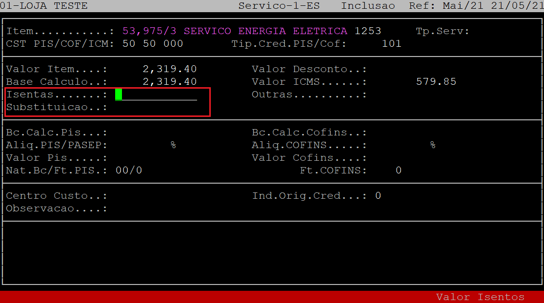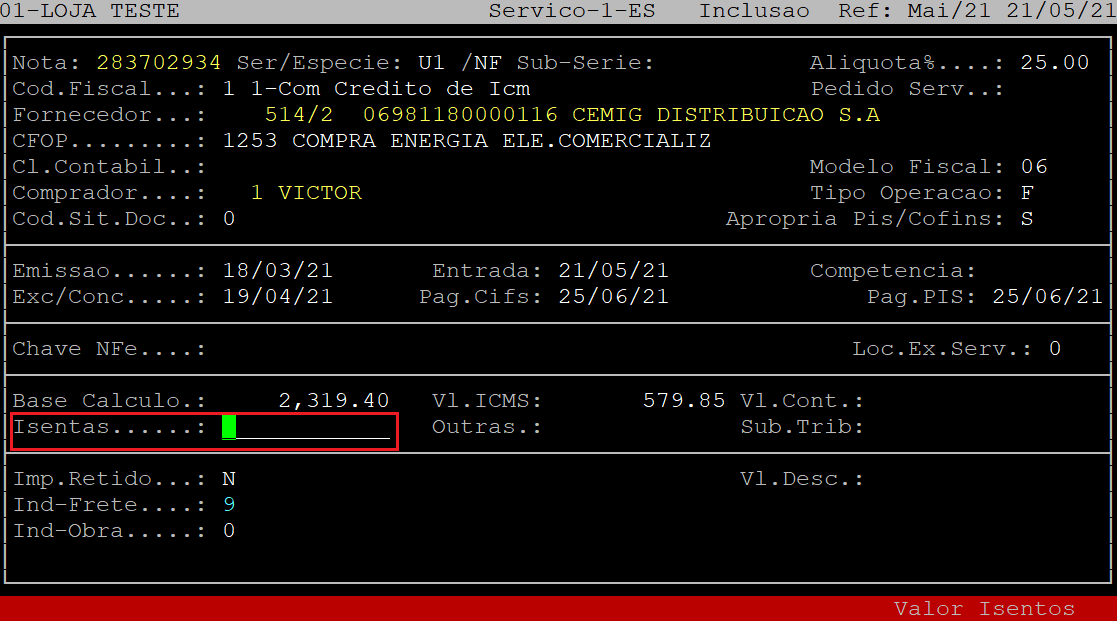 No campo Isentas, informe o valor isentas da nota fiscal e, aperte a tecla Enter. Se não existir esse valor, apenas aperte a tecla Enter para prosseguir para o próximo campo.