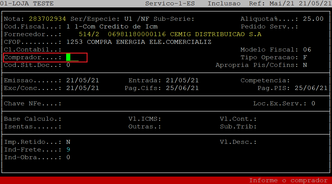 Em seguida, a janela dos dados do consumo será fechada e o cursor do teclado se posicionará no campo Comprador. Informe o código do comprador desejado, que esteja cadastrado no sistema (com três dígitos).