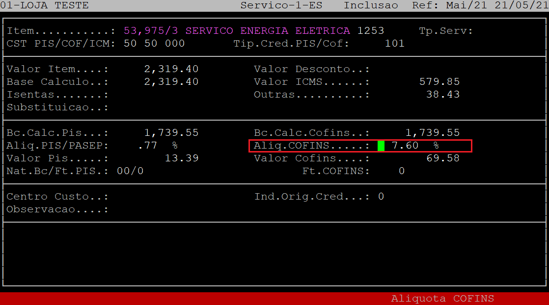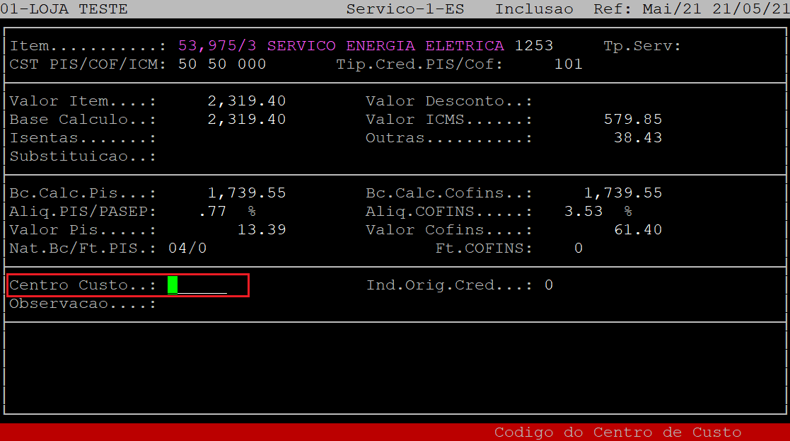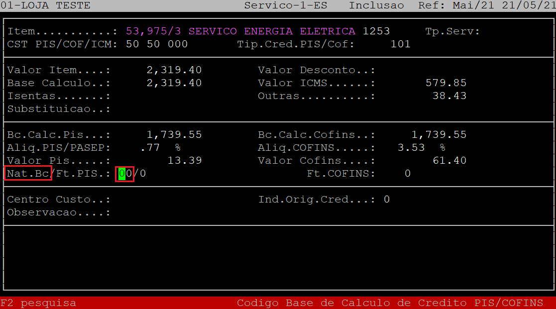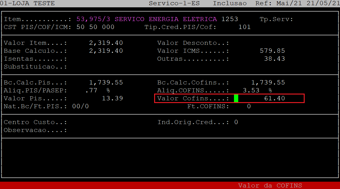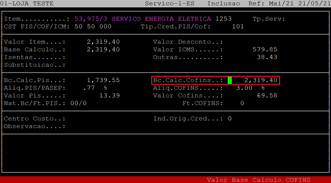 O campo Bc.Calc.Cofins será habilitado e preenchido automaticamente baseado nas informações da tela anterior, podendo ser modificado, caso necessário. Mas para que o sistema carregue essa informação, é necessário que o campo Apropria Pis/Cofins (tela anterior) esteja setado como S.