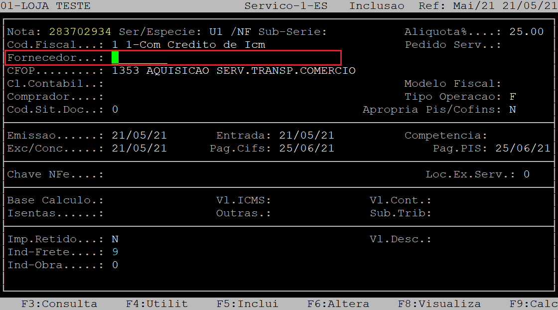 No campo Fornecedor, informe o código do fornecedor (Prestador do Serviço) previamente cadastrado no sistema (com o dígito verificador) e, aperte a tecla Enter.
