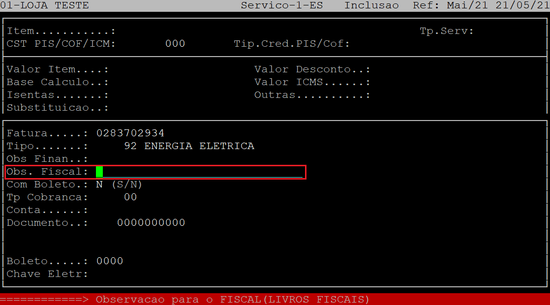 No campo Observacao, informe a observação referente ao documento que será gravado no Fiscal para futura consulta financeira, caso necessário. Se não desejar informa, apenas aperte a tecla Enter para prosseguir.