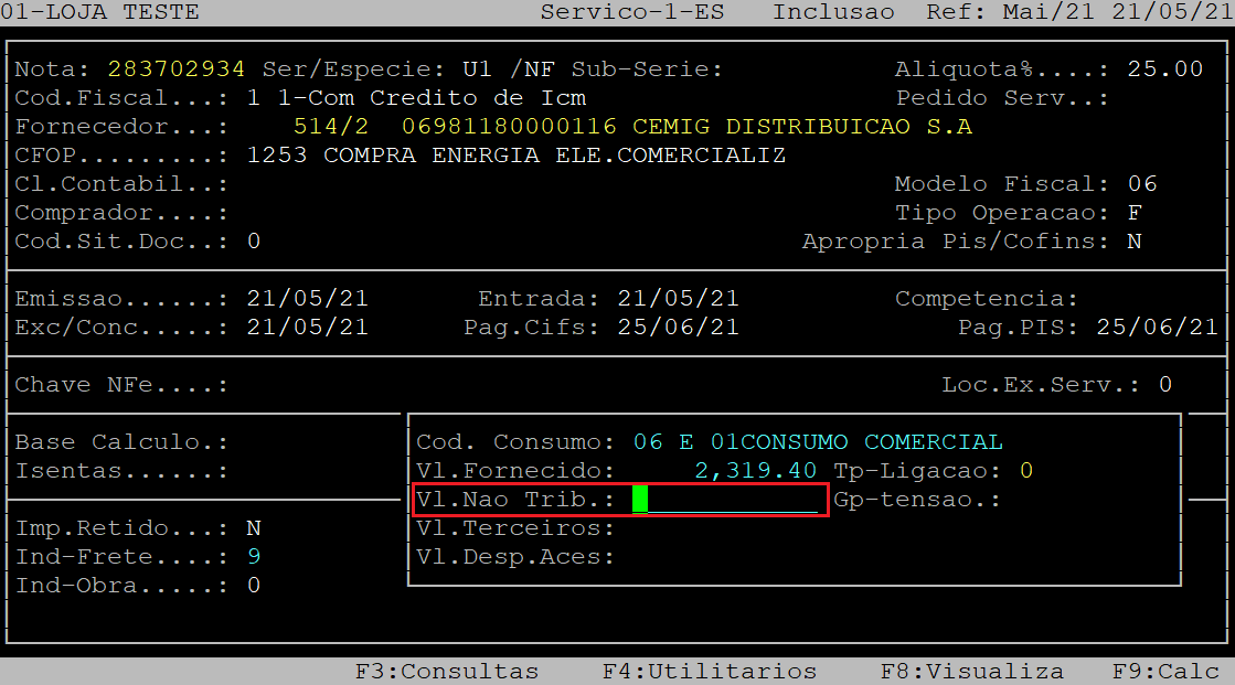 No campo Vl.Nao Trib, informe os valores dos encargos da nota fiscal, ou seja, valor dos encargos e serviços menos desconto se existir (exemplo: taxa de iluminação pública, multa e juros).