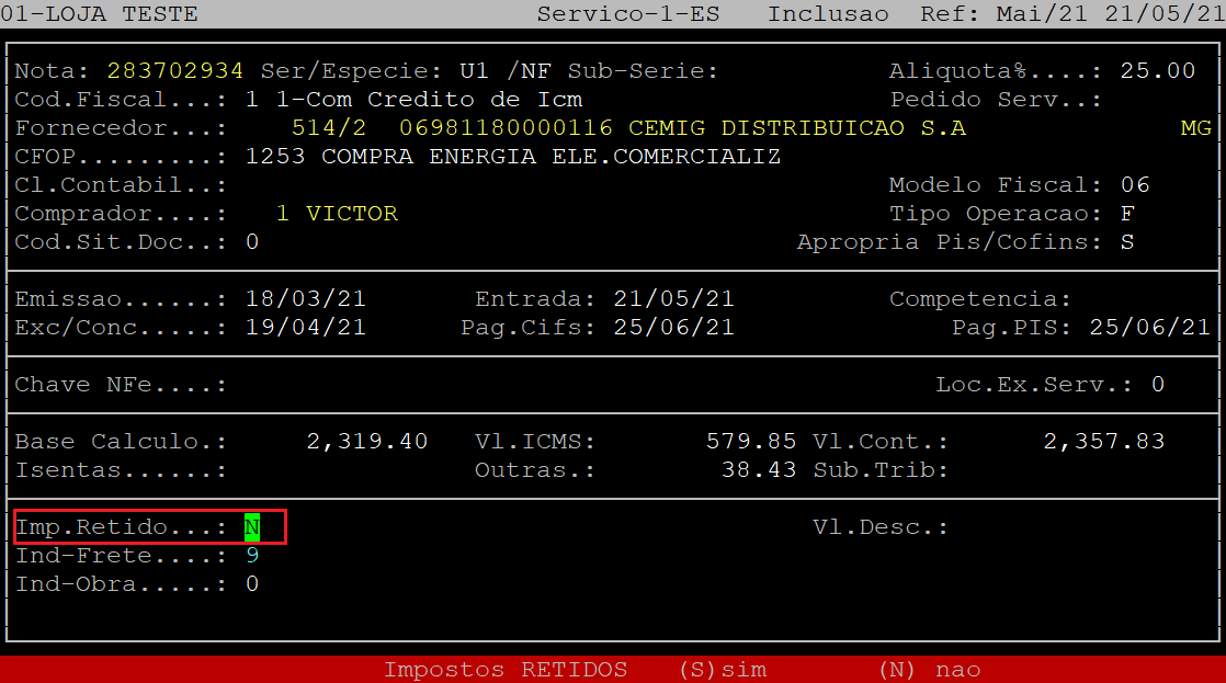 No campo Imp.Retido, informe a letra S se existir retenção de imposto na Nota Fiscal de Serviço que está sendo lançada, ou N se não existir.