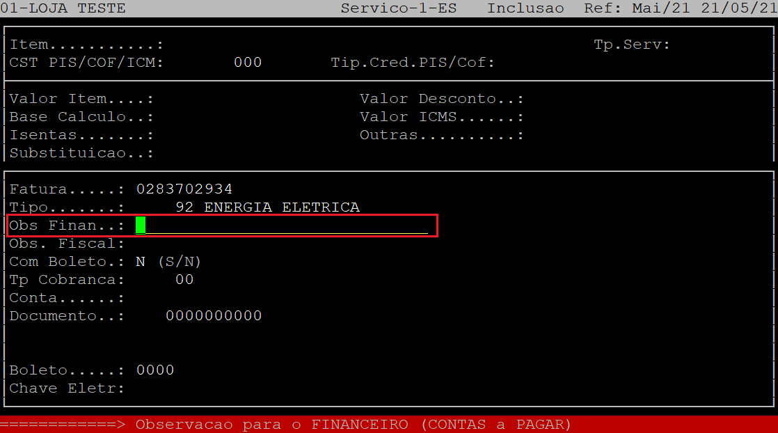 No campo Obs Finan, informe uma observação para o financeiro para ser exibida no Contas a Pagar e, aperte a tecla Enter. Se não desejar informar uma observação, apenas aperte a tecla Enter para prosseguir.