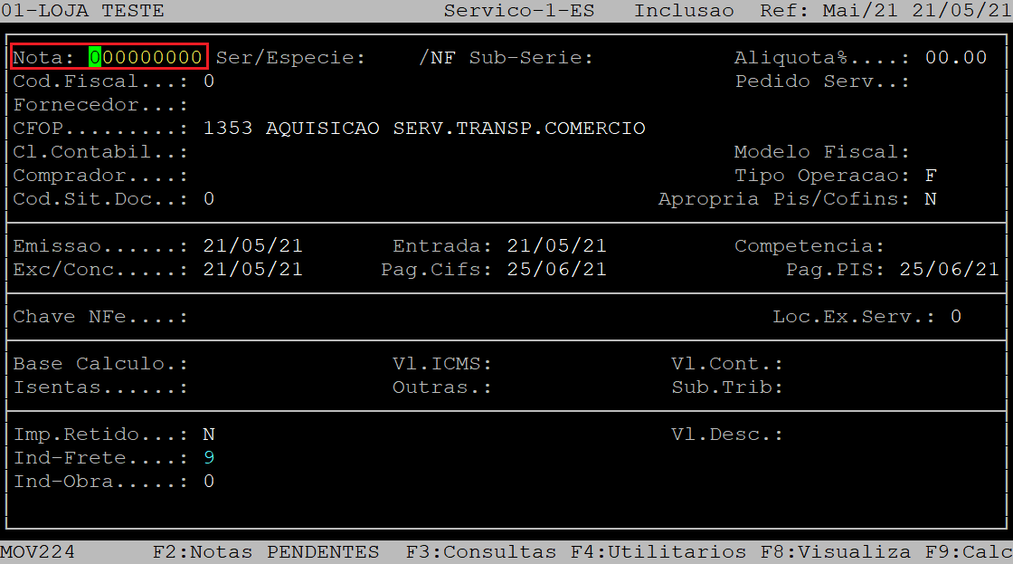 Ao acessar a rotina Servico - Inclusao, no campo Nota informe o número da Nota Fiscal que será lançada e, aperte a tecla Enter.