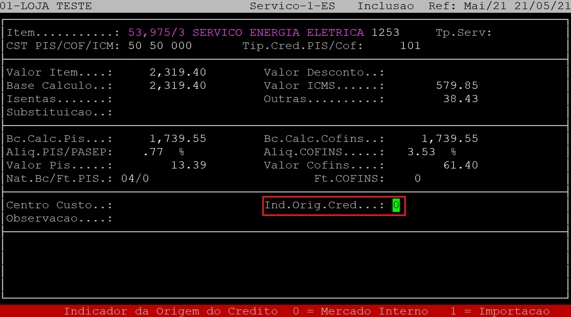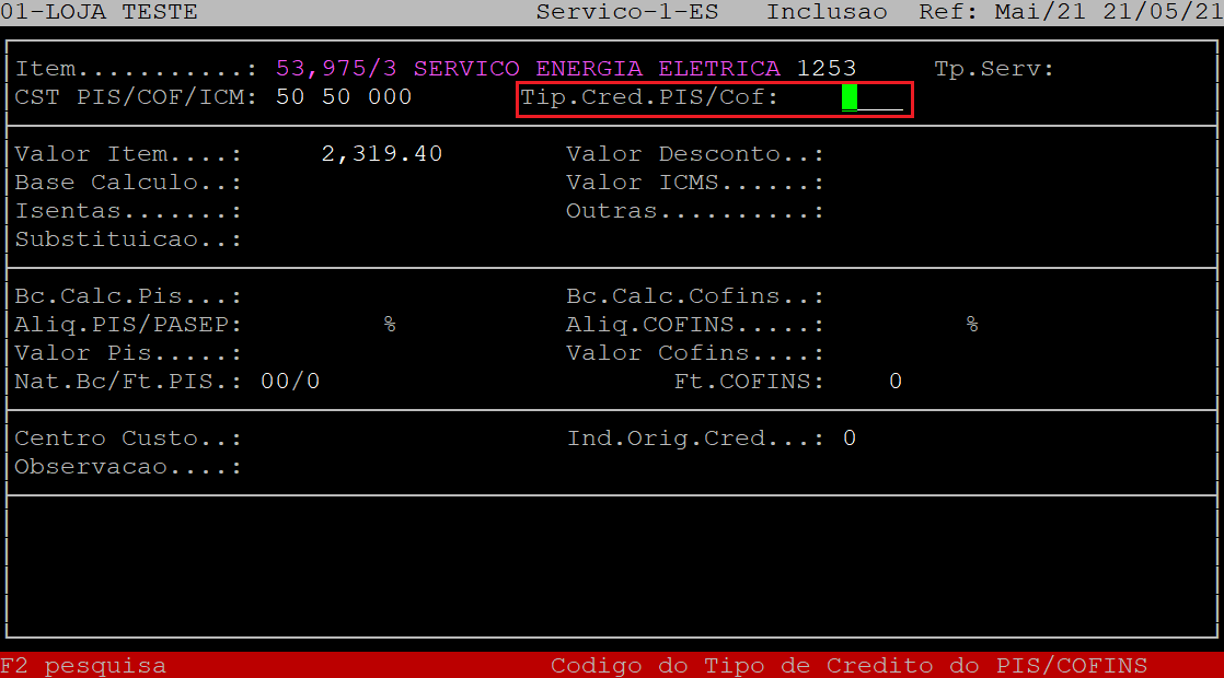 O campo Tip.Cred.PIS/Cof será preenchido automaticamente de acordo com o cadastro de produto. Porém, se desejar alterar, informe o tipo de crédito PIS COFINS (com três dígitos).