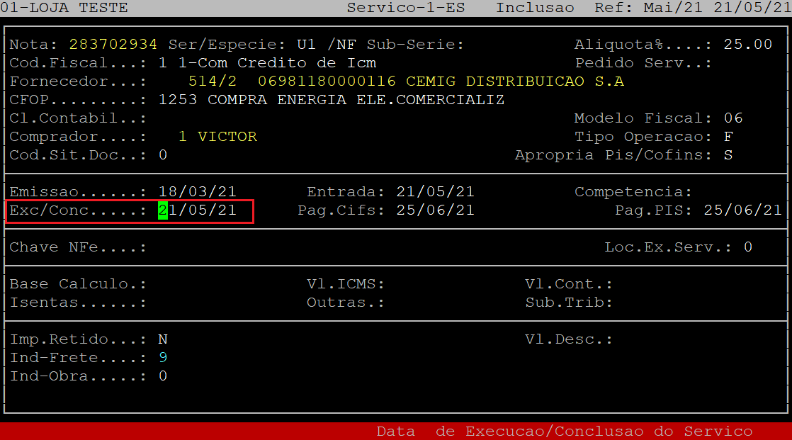 No campo Exc/Conc, informe a data de conclusão do serviço da nota fiscal (com dois dígitos para dia, mês e ano) e, aperte a tecla Enter.