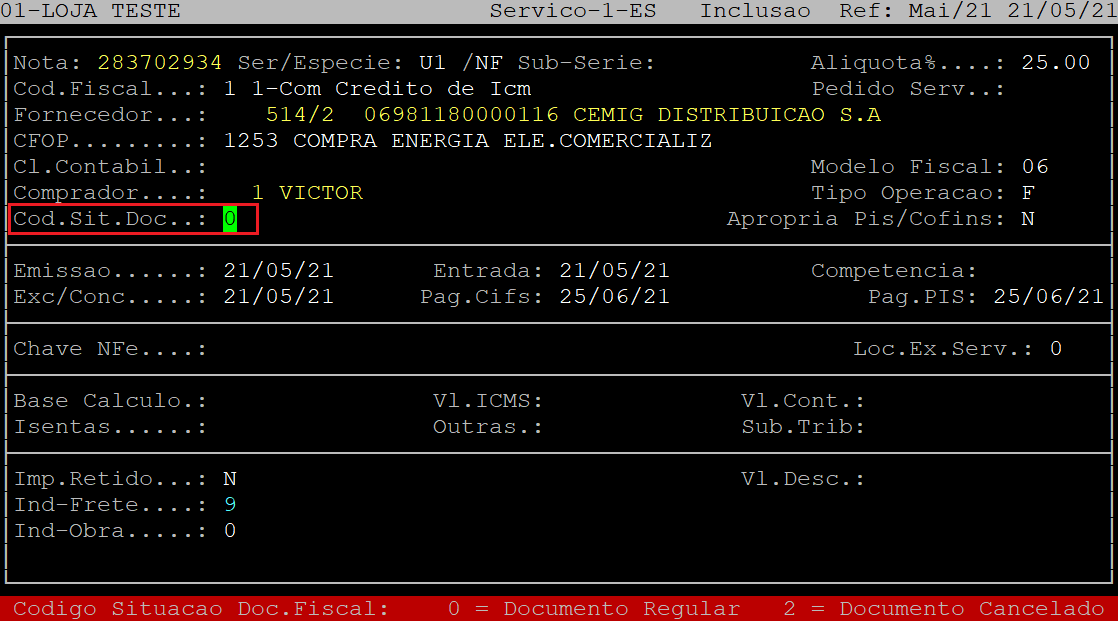 No campo Cod.Sit.Doc, informe o código da situação do documento fiscal, sendo: 0 - documento regular, ou 1 - documento cancelado.