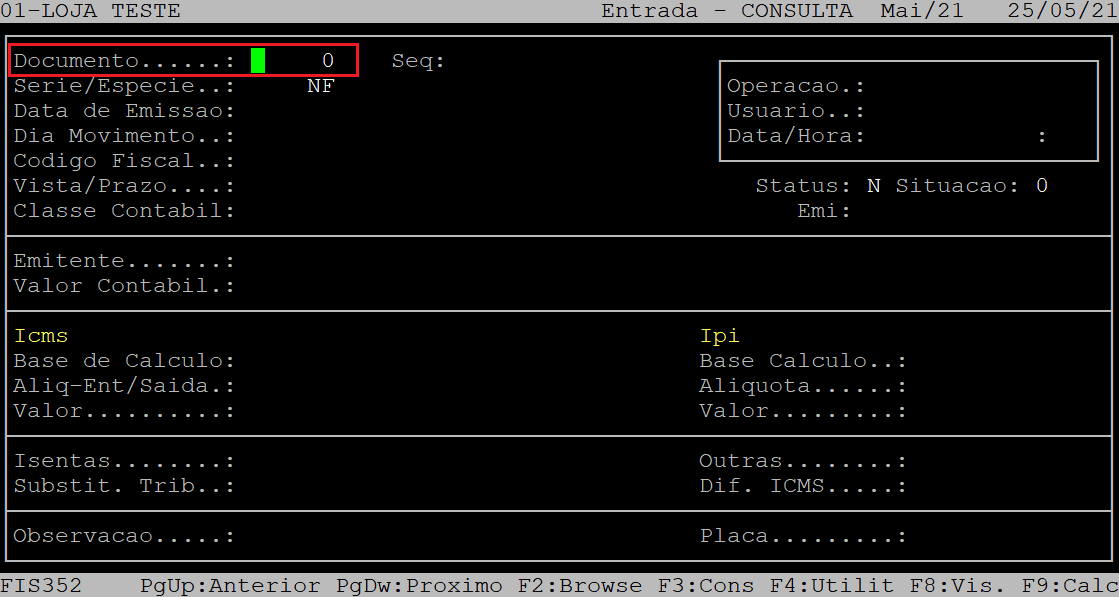Assim que acessar a rotina, informe no campo Documento o número da nota fiscal que deseja consultar e aperte a tecla Page Down até carregar as informações da nota.